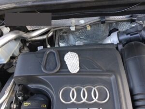 車内へコードを通したらゴム栓をはめて開けた穴をふさぐ様に防水用の両面テープを貼ります。その上に銀紙を貼り付け戻します。