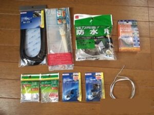 ※コイル型配線バンド、インシロック、起用力両面テープ(防水用)、カメラ固定用利用面テープ、下の段でクワ型端子セット(アース用)、キボシ端子セット(電源ヒューズ接続用)、線止め金具ミニ黒(車内用)、ステンレス配線止め金具(エンジンルーム用)、アルミ線(100均狭い所をカメラの線を通すのに使う)、10インチスパナ(アースのボルトを緩めるのに使用)、ラジオペンチ、マイナスドライバー、はさみ、カッターナイフ、等。こんなもんでしょう。