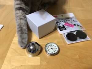 上の写真は時計の台座を外したところ。ねこちゃん協力。